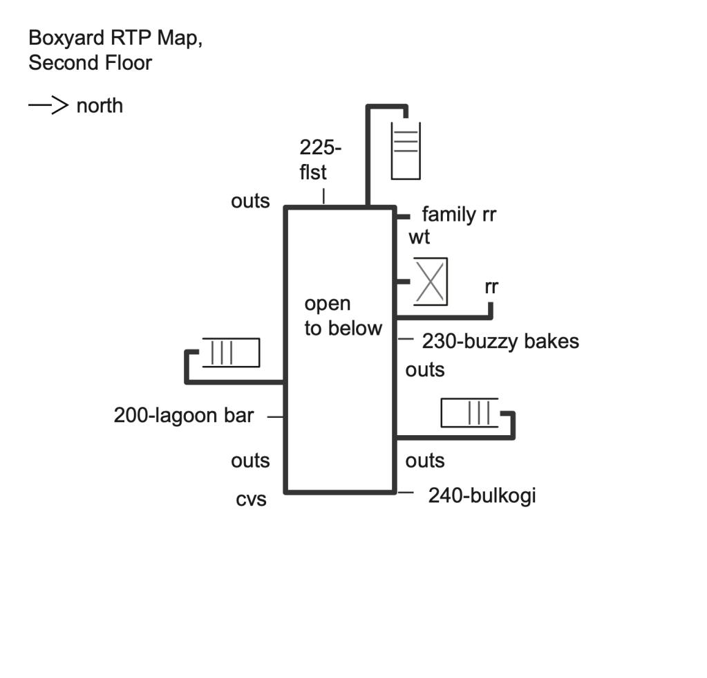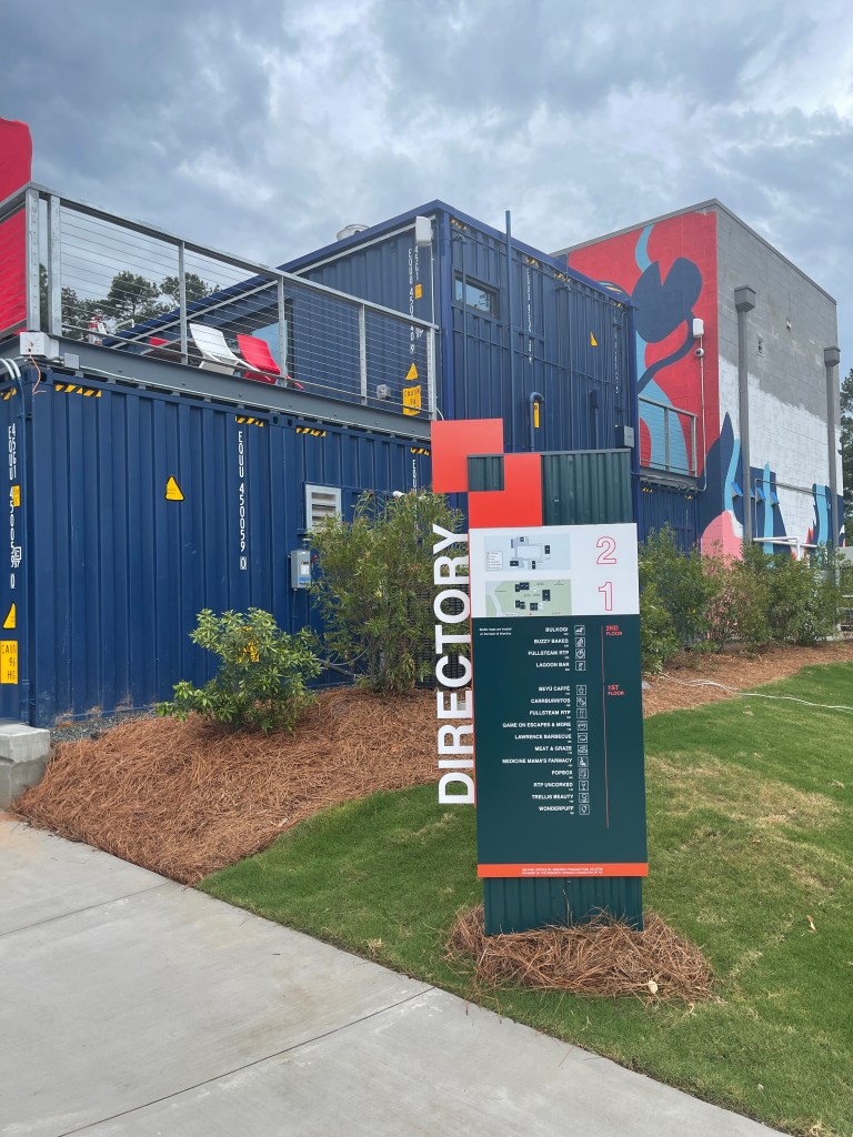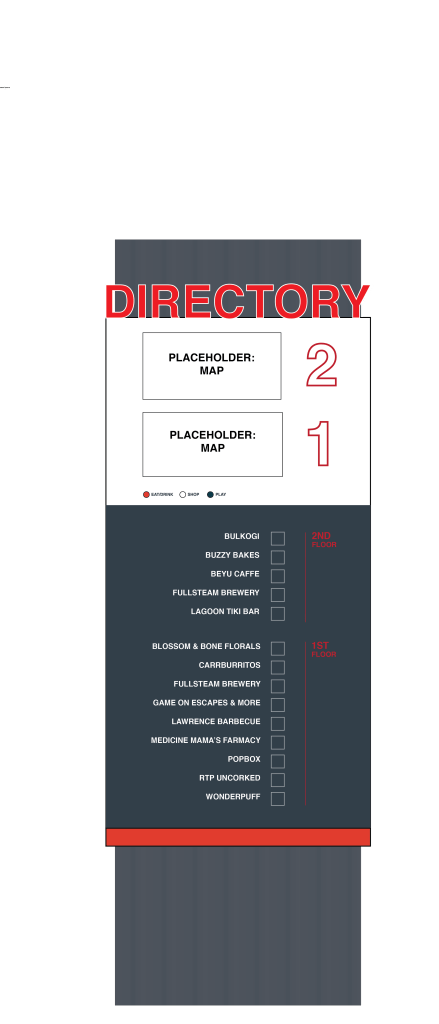 Final Drawing of the physical directory; vinyl lettering and using upcycled shipping container material from the construction site.